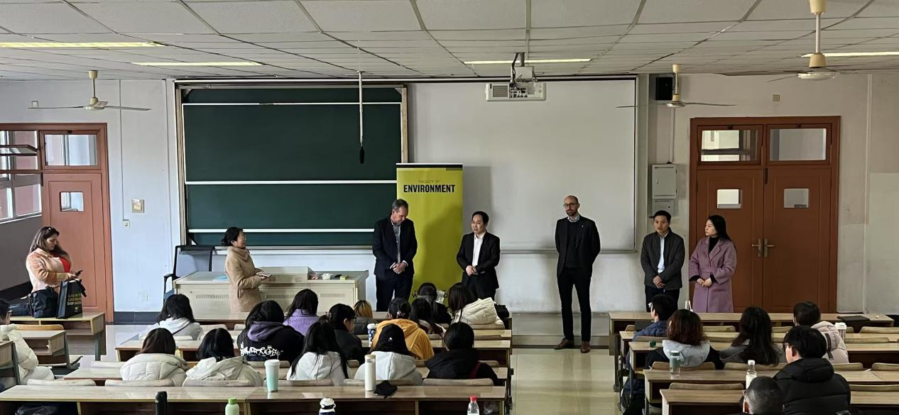 会谈结束后,Bruce Frayne院长一行前往博远楼看望工商管理专业中外合作办学项目学生。Bruce Frayne院长与同学们亲切互动,并解答专业发展相关问题,现场气氛热烈。