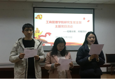 首先,主持人周婷介绍了目前南京的垃圾分类的具体情况,重点强调了栖霞区垃圾分类现状,指出栖霞区的垃圾分类情况位于南京市排行榜第二名。活动中,党员们通过趣味的垃圾分类小游戏以及垃圾分类知识抢答的方式,在更加欢快的气氛中学习垃圾分类的知识。随后,支部党员陈昌鑫、邓佳丽、卢慧敏三名同志分享了自己家乡的垃圾分类现状和自己的垃圾分类经历,并带来了精彩的诗朗诵——《我的祖国》。之后,支部党员将此次主题活动中学习到的垃圾分类的知识结合实践,对我们身边产生的垃圾进行了正确的分类。最后,支部书记周豪佳同志和支部副书记邱祥霞老师分别作了总结发言。