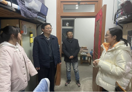 党委书记杨林在支部书记曾慧娟、支部辅导员老师冯玲和杨振宇的陪同下,深入本科生第一党支部2018级和2019级学生党员宿舍,开展“微走访”行动。
