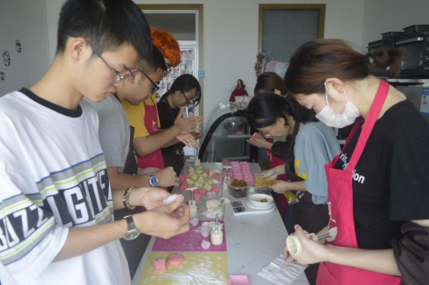 2019级新生制做月饼。在完成和冰皮粉、揉团、调馅、包馅和揉圆压扁的一系列步骤后,同学们用模具将不同颜色的面团压成不同图案的月饼形状,这样,一个个寄托着学长学姐真诚祝福的月饼便成功出炉了。