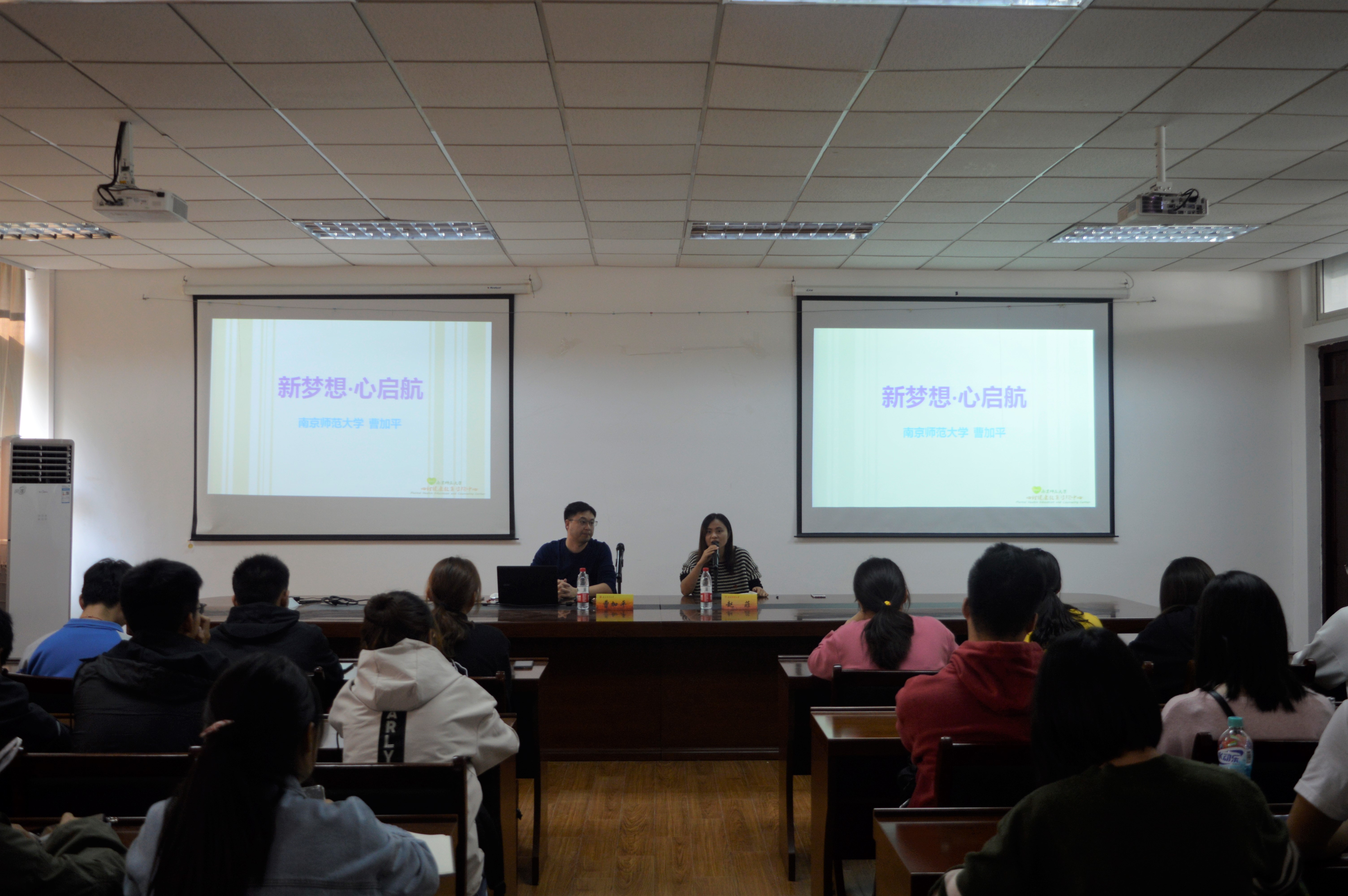 邀请南京师范大学学生处心理健康教育与咨询中心主任曹加平副教授在仙林校区德济楼408室举行“适应大学生活,用‘心’开启旅程”主题讲座。曹老师首先从学习、友情、爱情等角度分析了大一新生心理问题产生的原因,并对一些普遍存在的心理问题进行了简单的心理疏导。接下来,曹老师借助十只狐狸的故事以及生活中的实例给出了一些如何避免焦虑情绪、迷茫情绪的建议。整场讲座曹加平老师以幽默风趣的语言引起了大家的兴趣,开拓了同学们的知识视野、更新了他们的思想观点,相信通过本次讲座很多同学都会以更加得当的方式调节自己的情绪。