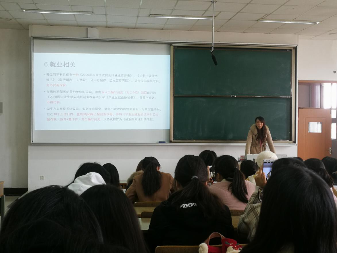 院毕业班辅导员冯玲老师在博远楼210教室召开了实习就业动员大会,2020届本科全体学生参加此次会议。