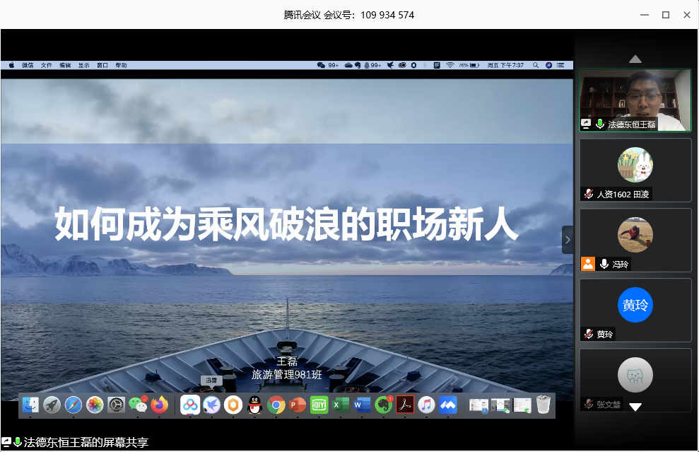 王磊主任从疫情现状出发提出应届生严峻的就业形势,鼓励在场学生在求职过程中需找到兴趣和未来的结合点,不能将范围局限于完全对口的行业。并提出理性看待理想与现实的差异、正视挫折等问题,对应届生适应身份变化提出细致性的建议和解决措施,助力本届毕业生更好地踏入社会、实现自我。王磊主任以法律人的身份提醒在场学生在签订合同之前、合同签订时和入职等各阶段的注意事项,做到确保自身合法权益不受侵害、免受劳动纠纷困扰。最后,就应届生如何提升自身能力以致寻求更好的职业发展机会提出自己的看法,从保持不断学习的心态、选择与努力并重、紧跟时代发展的趋势、做正确的事而不是正确的做事和树立目标及抓住机会五个方面展开了细致入微的分享。会议最后,全真真从应届生就业优势、做有大局观、真正独立的成年人等方面,鼓励同学们努力奋斗,做乘风破浪的职场人。