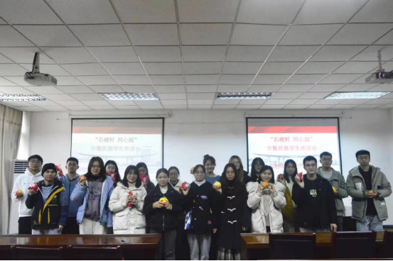 为参会的同学赠送石榴,表达了希望各族学生要像石榴籽那样紧紧团结在一起的心意。