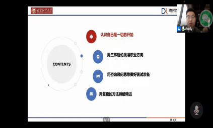 院人力资源专业09级毕业生、南京德锐企业管理咨询有限公司的合伙人、项目总监、产品总监李志华通过腾讯会议作了题为“赢在起点”的南财就业讲堂线上讲座。讲座由乐玩网络游戏