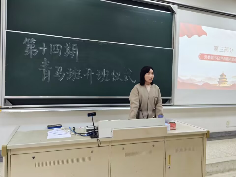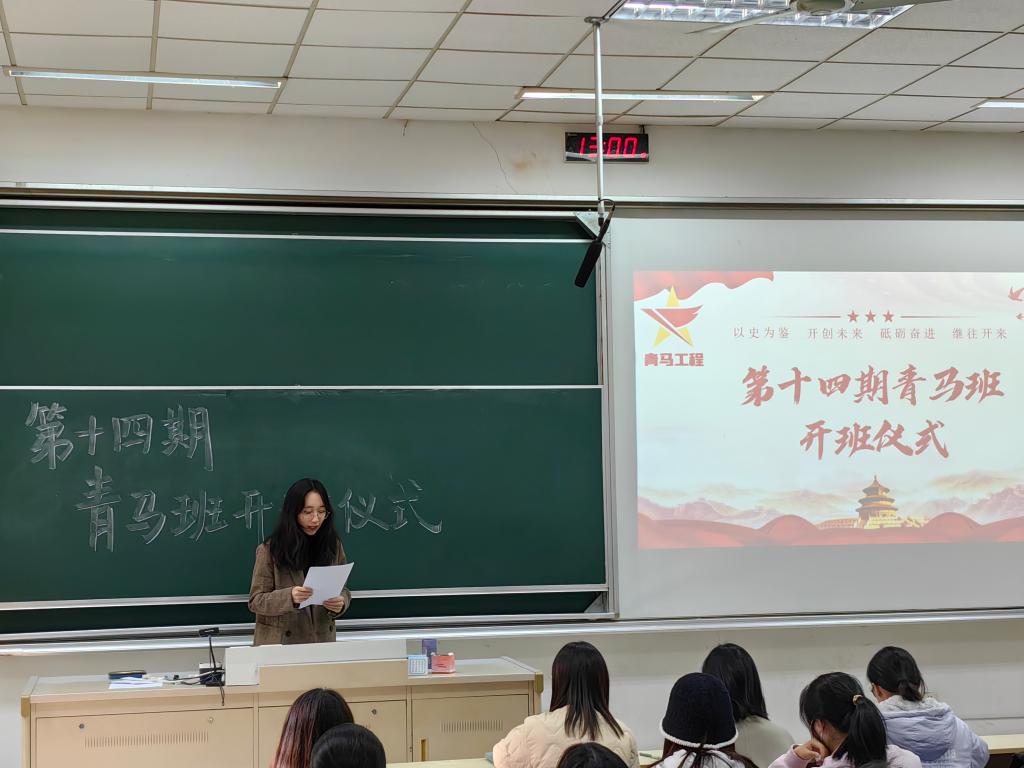第十四期青马班纪律及注意事项,并从课程设置、考核管理、纪律管理等方面进行详细介绍,以便更好地规范学员们的行为。接着,第十三期青马班优秀学员代表人资2201班王艺锦同学发言。他表示,青年兴则国兴,青年强则国强,作为新时代的青年,要有理想、有担当,要提高自己的政治素养,加强自己的科学文化素质,为祖国和社会贡献自己的力量。