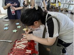 在迎新现场,新生们在报到处核验身份后便可以领取一张星星形状的贴纸,他们在上面写下自己的名字并贴在星空签到墙上。每一颗星星都散发着独特的光芒,每一个人都将在南财追逐光,成为光,散发光,照亮未来的求学之路。签到完毕后,新生们移步至读书角领取励志书签,并书写推荐书籍及寄语,领取南财定制明信片、钥匙扣等文创礼品。迎新过程中,程永波校长一行来到乐玩网络游戏