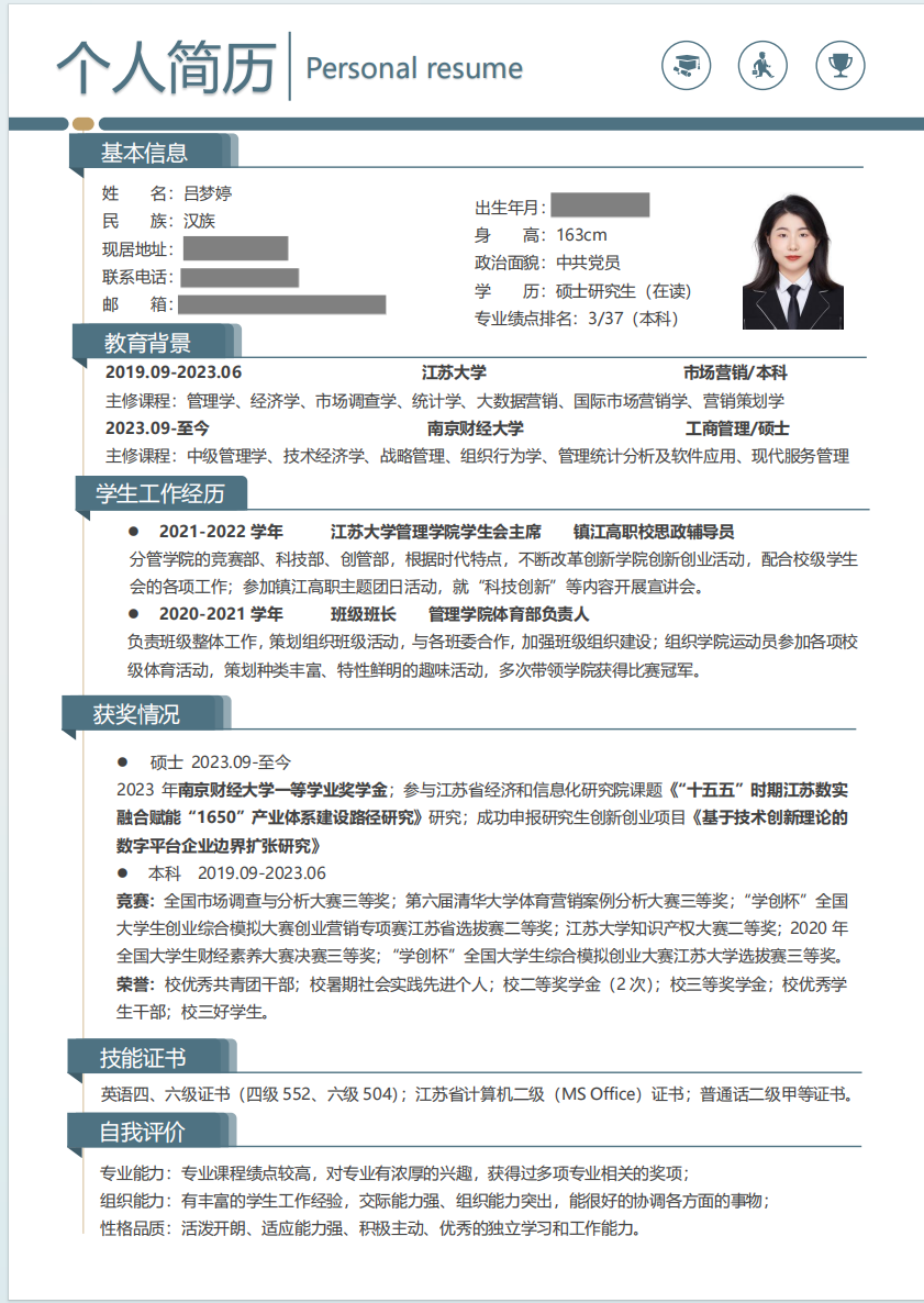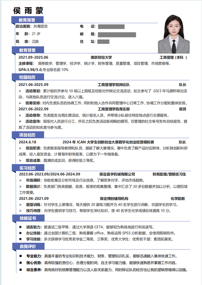 必要部分:确保简历包含个人信息、教育背景、工作经历、校园活动、荣誉奖项、技能和兴趣爱好等关键内容;
