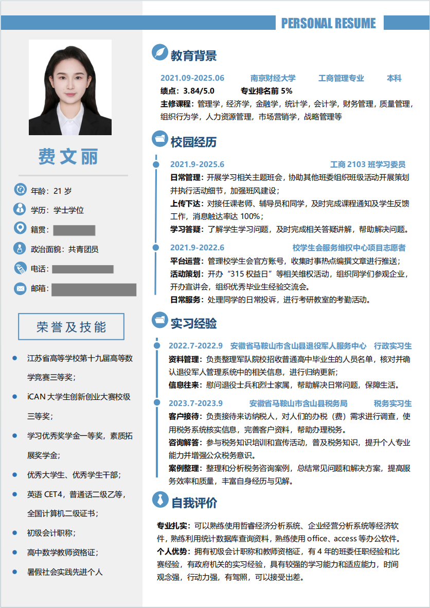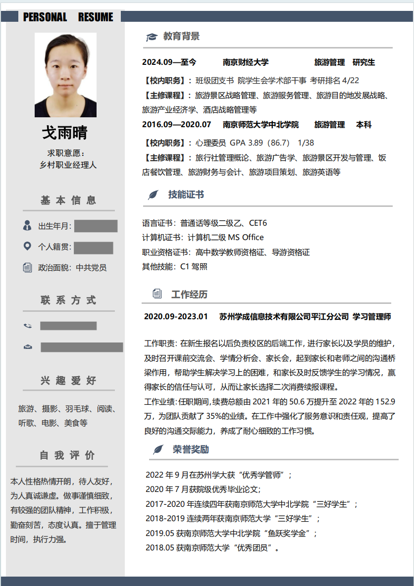 时间顺序:个人经历应按照时间倒序排列;
