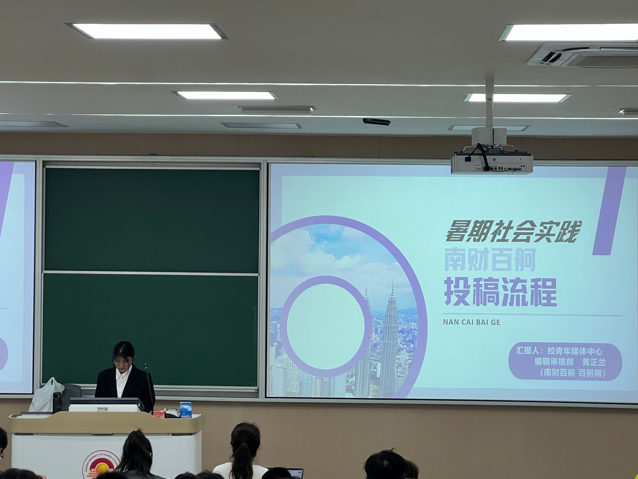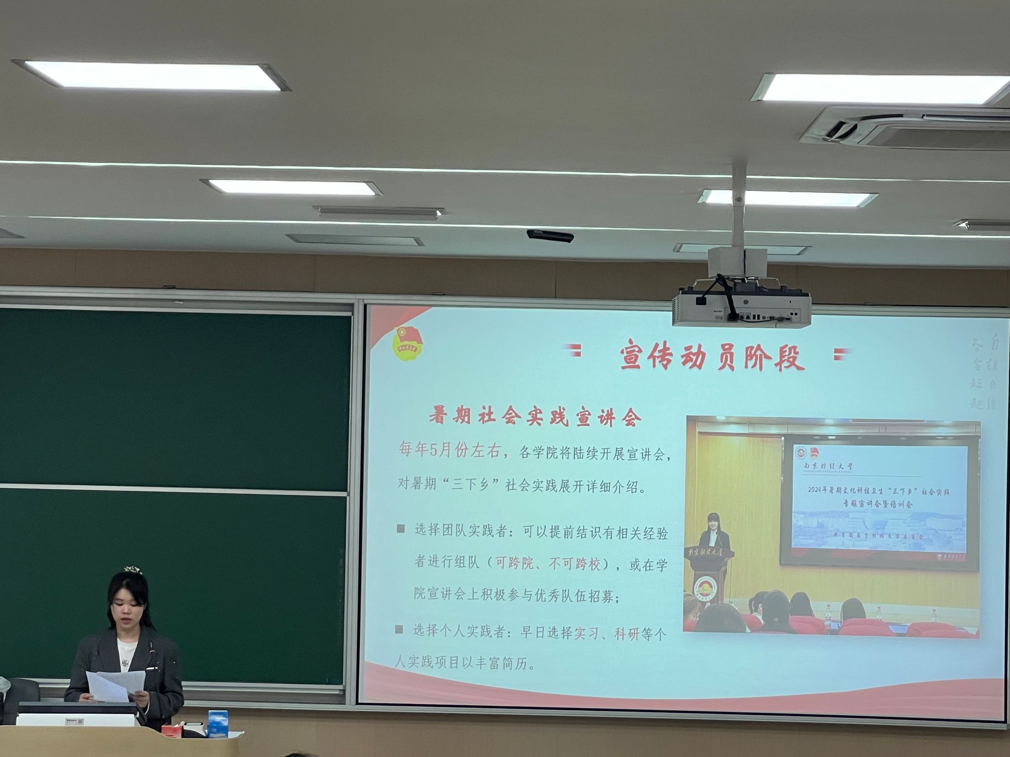 “重力、重思、重行”的实践育人体系。随后,校青年媒体中心负责人朱雪彤分别从投稿方式、投稿要求、投稿流程三方面,详细讲解暑期社会实践新闻稿投稿细则,明确暑期社会实践新闻稿的重要性、规范性以及投稿的时效性。接下来,2024年“三下乡”暑期社会实践优秀团队代表鲍宇杰结合自身经历分享实践经验,他建议同学们结合专业优势寻找实践项目切入点,在调研中扎根基层,并将调研成果转化为专利发明、公益项目等实际应用,让青春在服务社会中绽放绚丽之花。