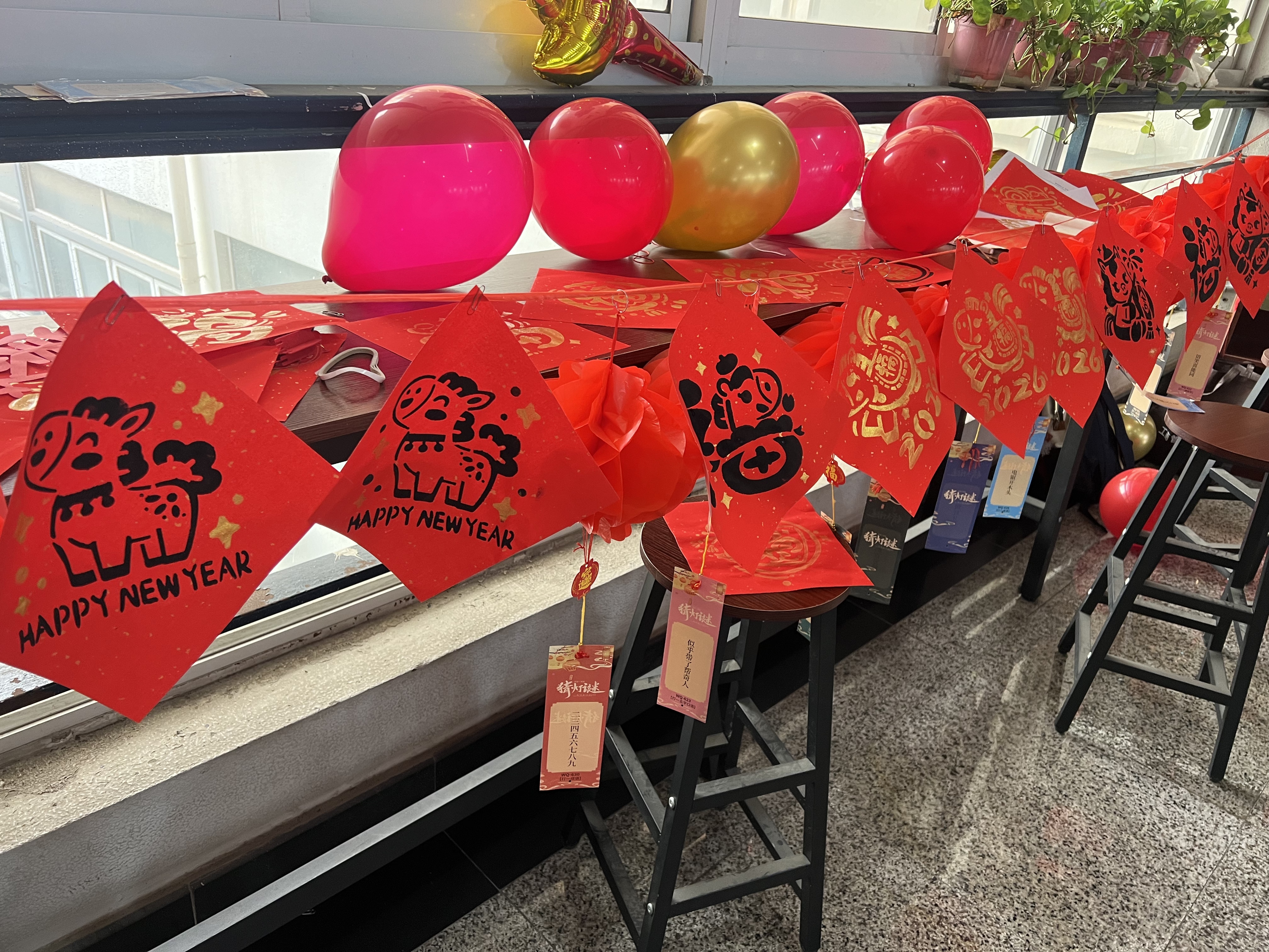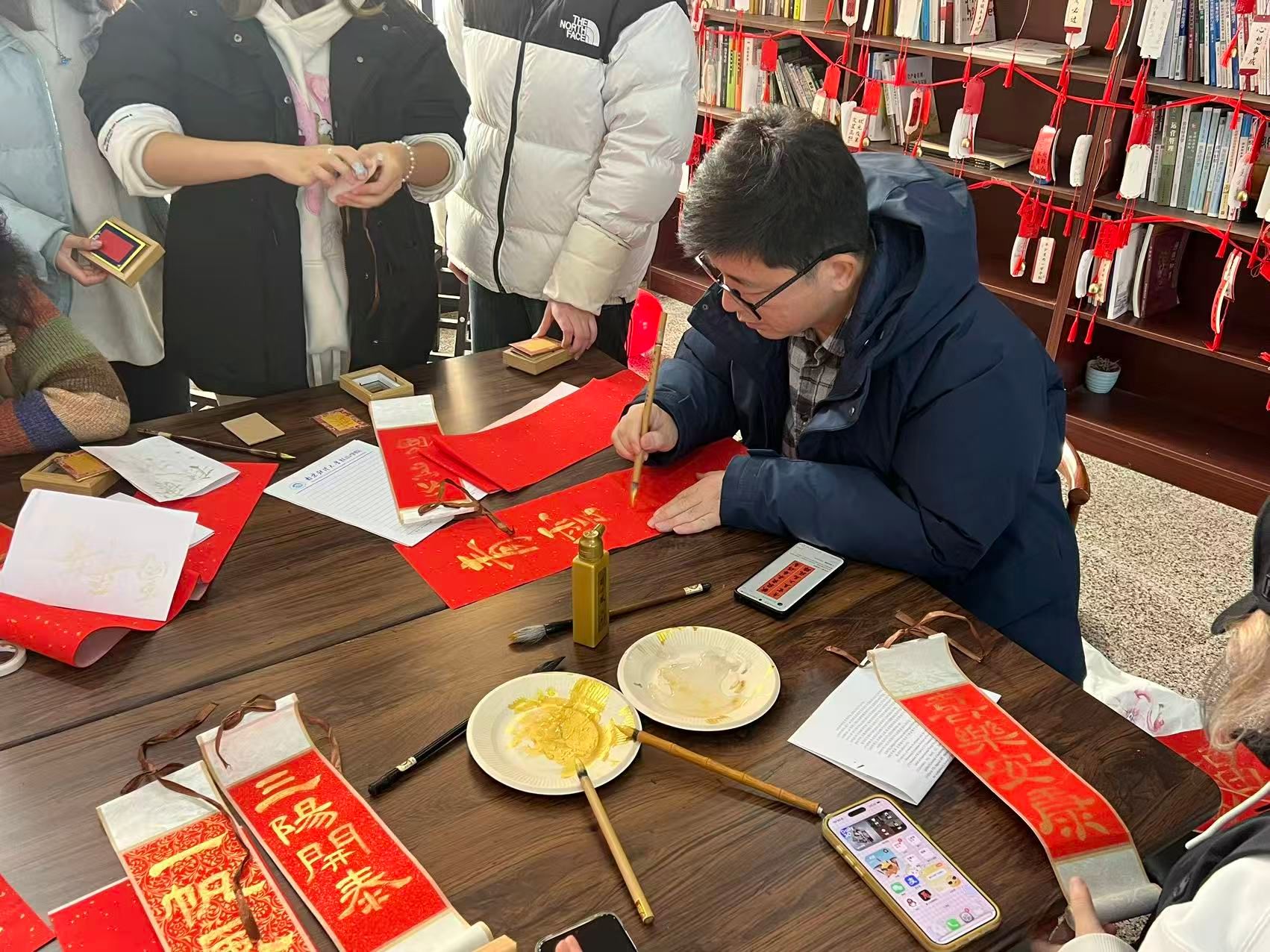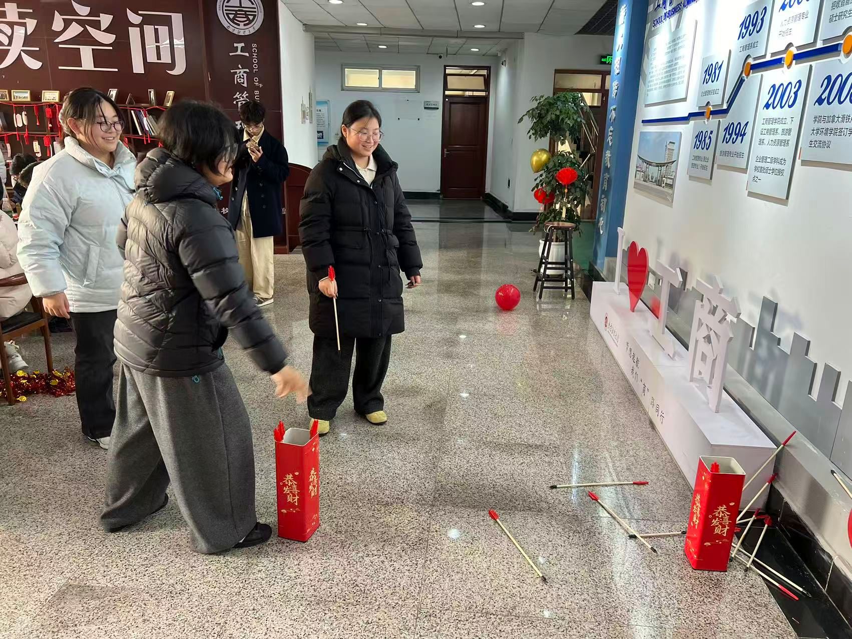 游园会现场,五大文化体验区——“智慧灯谜阵”“巧手剪纸轩”“书画迎春坊”“冰糖葫芦DIY铺”及“投壶竞技场”依次排开,交织出一幅生动的国风迎新画卷。同学们穿梭于各区域之间,在“智慧灯谜阵”里凝神思索,领略汉字与传统的隽永魅力;在“巧手剪纸轩”中执剪裁春,感受非遗技艺的精妙传承;于“书画迎春坊”内挥毫写“福”,寄托对未来的美好憧憬。冰糖葫芦制作区笑语盈盈,大家串果裹糖,共享亲手制作的甜蜜年味;投壶场上欢呼阵阵,传统游戏的趣味拉近了心灵的距离,洋溢着团结与欢乐。张杰书记与师生们亲切互动,共同体验民俗项目,现场气氛温馨热烈。颜丙金老师现场挥毫,以笔墨传递祝福,与同学们在书香墨韵中共迎新春。