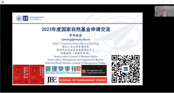 报告中,针对管理学科国家级课题申报方法和注意事项,贾明教授分别从基金评审、管理学基金、撰写基金三个方面进行详细讲解。强调基础研究的创新特别是原始创新通常应具有独创性,包括新的学科问题、新的研究方法、新的技术路线、新的假设前提、新的分析框架等,体现为“原创、前沿、需求和交叉”。同时对青年教师提出建议:明确项目定位,将青年科学基金定位在人才类型项目,明确其要求是稳定青年队伍、培育后继人才、扶持独立科研、激励创新思维。最后,贾明教授分享了一些选题的体会,要牢牢把握国家的战略需求,紧跟时代要求,发挥个人和团队的优势选择恰当的题目。在互动交流环节,贾教授对老师们提出的各种国家课题申报有关问题进行了清晰详尽的解答。老师们纷纷表示,通过开展此次讲座,对于国家课题申报具体实践方面有了更加清晰的认识和理解。