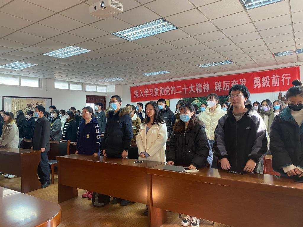 党员师生代表、发展对象代表、入党积极分子代表参加会议。会议室内环境肃穆,全员神情凝重,默默表达着对江泽民同志的怀念与哀思,悼念这位我党我军我国各族人民公认的享有崇高威望的卓越领导人,缅怀江泽民同志的光辉业绩,颂扬江泽民同志的伟大情操和崇高品质。