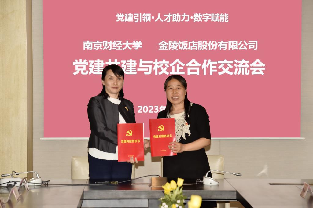 书记张杰与金陵饭店股份公司党委书记、董事长李茜代表双方签订党建共建协议,姚文韵副校长与金陵饭店集团党委副书记周锦银共同为“党建共建单位”揭牌。