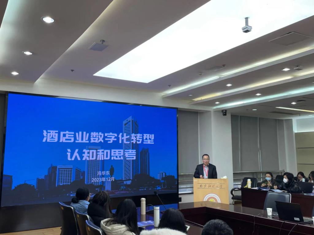 冯华东总经理作了题为“酒店业数字化转型的认知和思考”的报告,从实践角度讲述企业数字化转型的经验。冯华东介绍了当前经济发展现状和趋势,并结合自身工作经验,从战略、业务、管理、技术四个层面,提出了企业数字化转型成功的关键因素,最后以解决了集团酒店板块卡脖子问题的战略行为——“尊享金陵”项目为例进行进一步阐述。