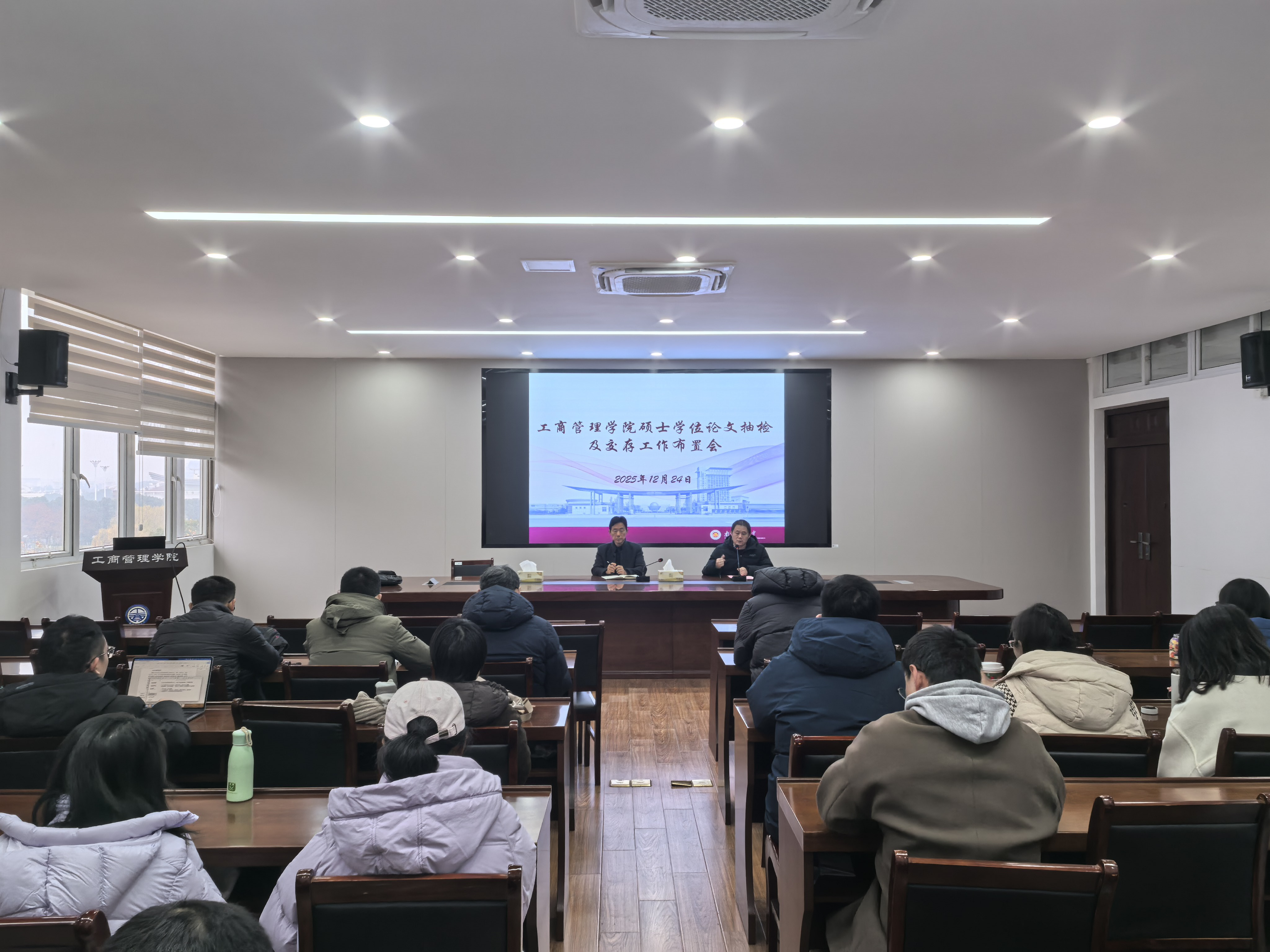 在德济楼408会议室召开硕士学位论文抽检及交存工作布置会。院长万绪才、副院长刘泽华出席会议,全体硕士研究生导师参加会议,会议由副院长刘泽华主持。