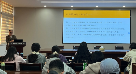 黄来勇先生从“人、城市、消费”的视角阐释了城市更新与文旅融合背景下文旅商业融合发展和运营逻辑。首先,黄来勇先生从城市更新的三大必要性,包括“国有资产市场化运作、废弃资产资源回收、城市使用归属权转向”出发,引入讲座主题。其次,提出“在地叙事”是商业发展驱动的城市更新逻辑,并就“在地叙事”的三大建构及其深度参与的合肥骆岗公园、淮河路步行街、环城公园、欧风街、合柴1972、罍街、新粮仓等城市更新项目,对如何依托商业发展重构城市公共性、深化人与城市关系进行了深刻剖析。最后,黄来勇先生对旅游管理系同学的能力培养、就业创业方向提出了建议。整个讲座过程理论与实践结合紧密,通过生动的案例展示深入浅出地解构了文旅商融合的热点与难点,与会同学全神贯注、收获颇丰。
